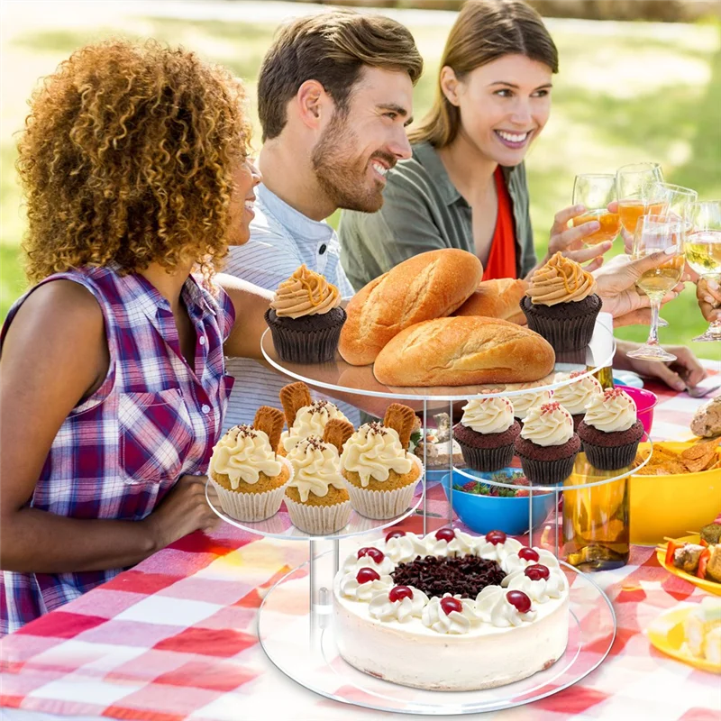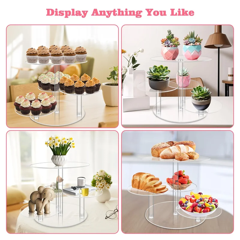 Elevate your dessert presentation with this 4-tier acrylic cake and cupcake stand. Its unique tiered structure ensures every treat is visible and accessible, with the top tier perfect for a large cake and lower tiers ideal for cupcakes, pastries, or other desserts.
