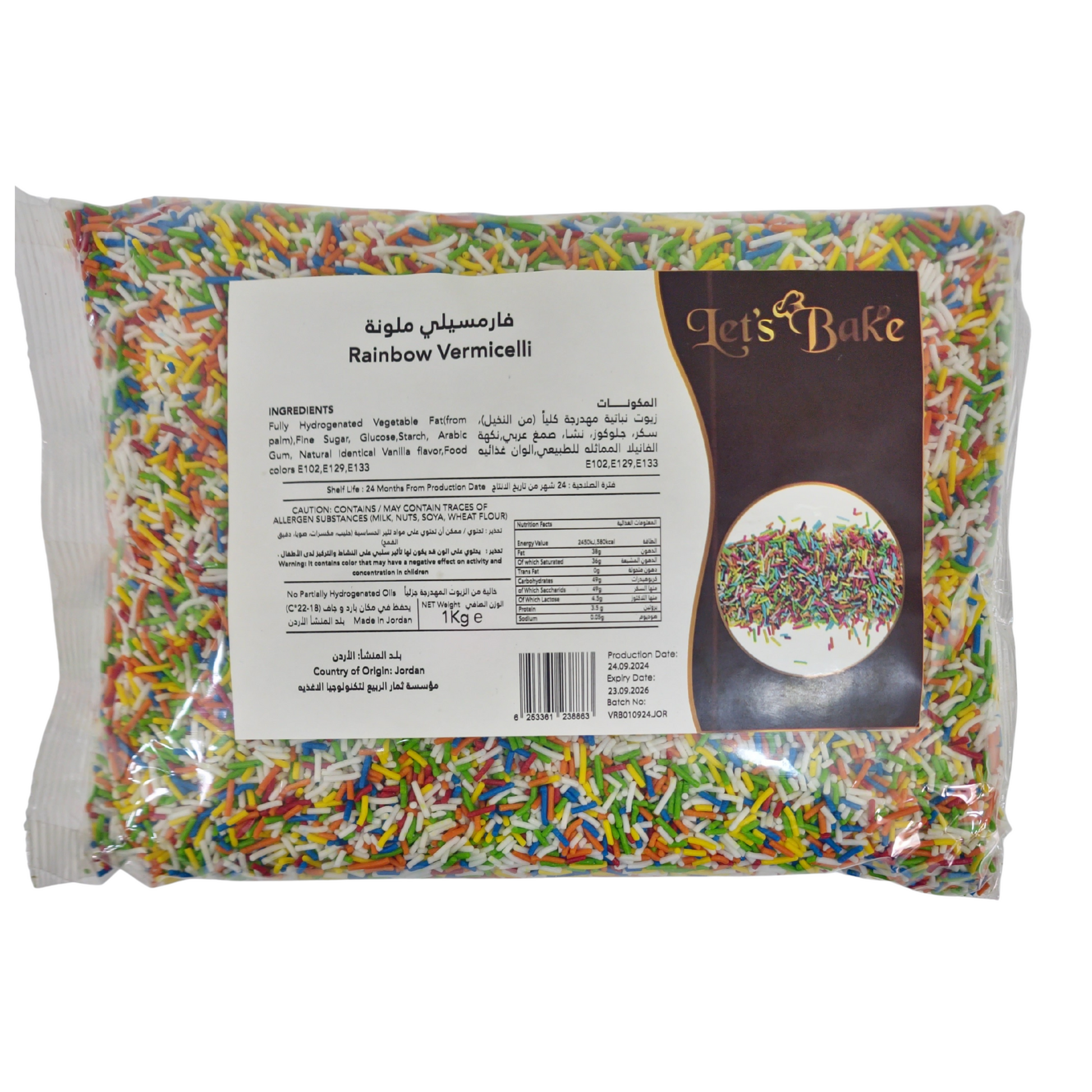 Add a burst of color and fun to your desserts with Let’s Bake Rainbow Vermicelli! Proudly made in Jordan, these vibrant and sweet multicolored strands are perfect for decorating cakes, cupcakes, cookies, donuts, ice cream, and more.
